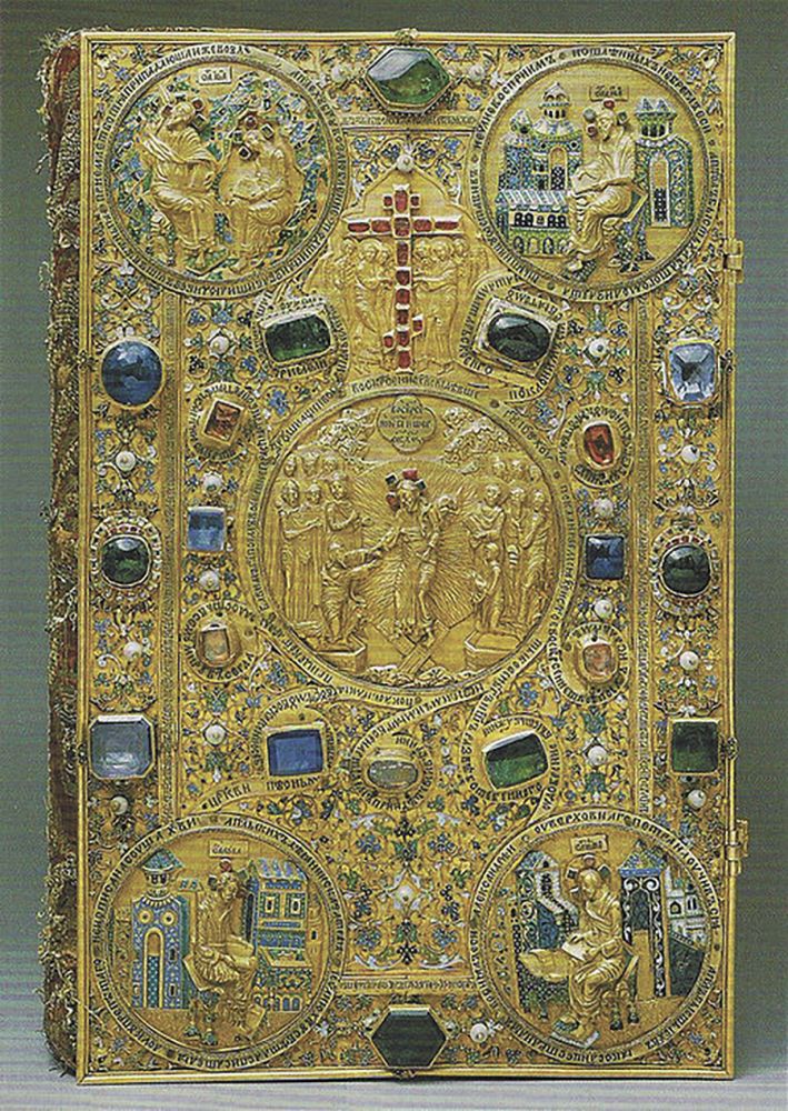 Ну а какой же экспонат был внесён в учётные книги музея все-таки самым первым? В книгу поступлений под номером 1 вписано напрестольное Евангелие в золотом окладе, украшенном драгоценными камнями, жемчугом и разноцветными эмалями. Это был вклад в Троицкую обитель в 1632 году первого царя из династии Романовых Михаила Фёдоровича и его отца патриарха Московского Филарета Никитича. Но в настоящее время увидеть этот музейный предмет в Сергиево-Посадском музее-заповеднике не удастся: в 1928 году книга была передана в Оружейную палату и ныне является экспонатом Музеев Московского Кремля.