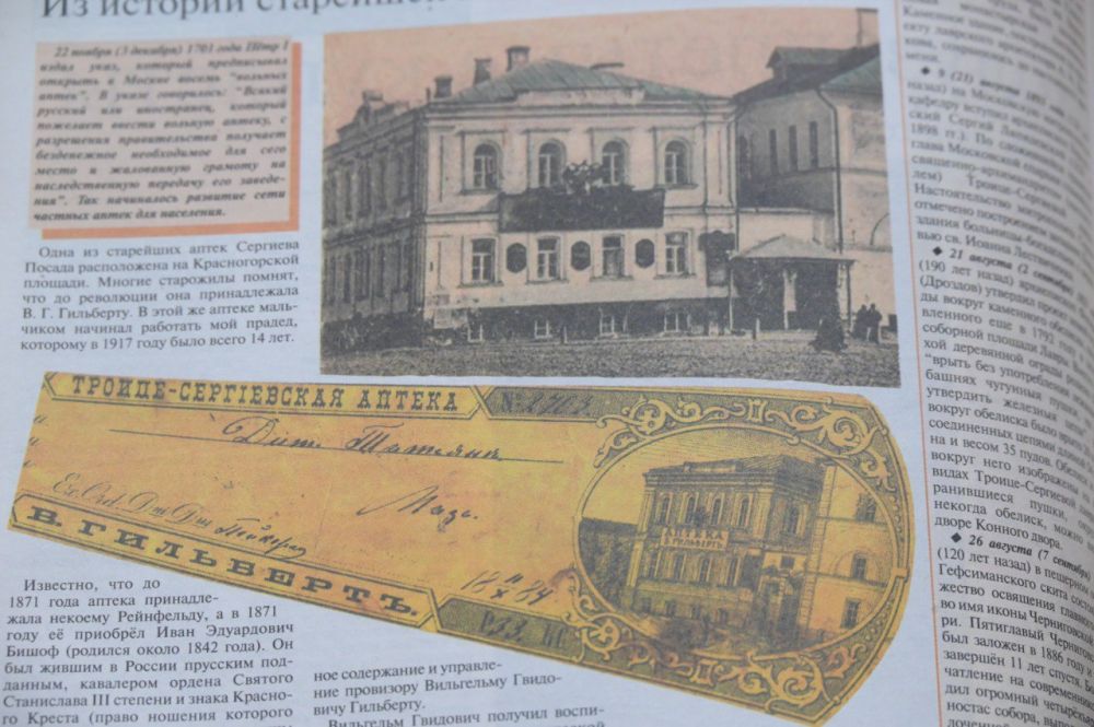 Аптека на Красногорской площади — одна из старейших в Сергиевском посаде. У здания много раз менялись хозяева, оно подвергалось национализации после революции, но на протяжении всей полуторавековой истории в нём неизменно продавались лекарства.