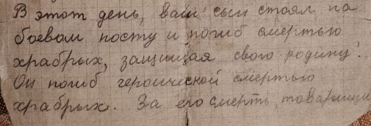 «Здравствуйте, дорогие мама и сёстры Галя, Мая и Мирослава! Шлю вам свой пламенный красноармейский привет. Вопервых, я вам сообщаю, что сейчас нахожусь на фронте. Вот уже с первого декабря нахожусь в боях с немецкими фашистами. Вы, наверное, хорошо знаете, что немцы окружили нашу столицу и уже совсем близко подошли к Москве. Сейчас мы их гоним без остановки, немецкие фашисты удирают из наших городов и сёл, оставляя своё оружие и своих убитых. Мы заняли много сёл, но обогреваться нам негде, немцы в сёлах не оставляют ни одного дома, всё сжигают. Население остаётся без пищи и жилья. Я себя чувствую хорошо, здоров. Скоро, наверное, немцев выгоним из своей страны и тогда, может, удастся нам снова жить вместе. Обо мне не плачьте. (...) Покуда до свидания, остаюсь ваш сын и брат Хендрих. Описал бы я вам всё подробно, но сами знаете, в каких я условиях. Скоро пойдём на отдых, тогда опишу всё подробно».