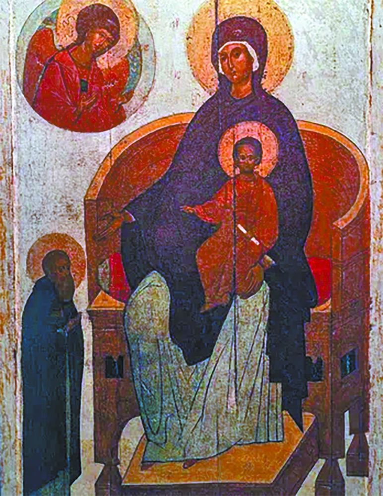• Икона «Богоматерь с Младенцем на престоле, с преподобным Сергием Радонежским и ангелом», 15 век. Это один из самых загадочных экспонатов выставки, который хранится в Историческом музее. Происхождение этого уникального произведения остаётся во многом неизвестным. Икона была передана в Исторический музей из музея «Александровская слобода», куда после революции свозили иконы из закрытых храмов и монастырей. Этот образ Богоматери поступил туда в 1920-е годы из Стефано-Махрищского монастыря. Вопросы о времени создания иконы, её первоначальном храме и пути в монастырь остаются без ответов на протяжении многих лет. По одной из версий, икона могла быть надгробной и изначально находилась у гроба преподобного Сергия в Троицком соборе.
