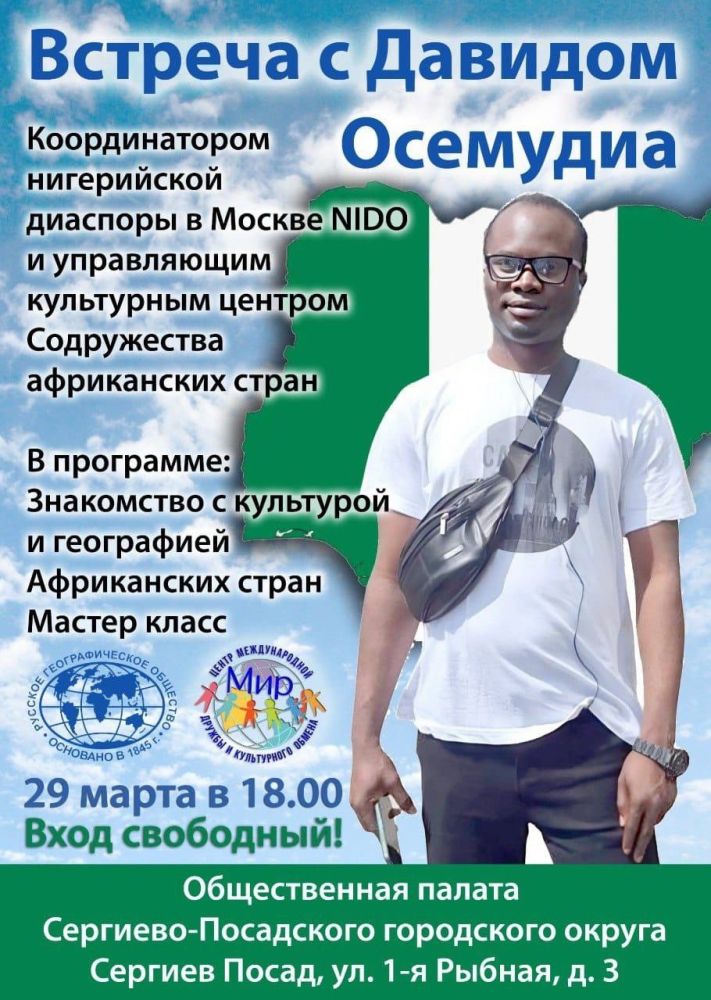 29 марта состоится встреча с Давидом Осемудиа, управляющим культурным центром Содружества африканских стран и координатором NIDO — нигерийской диаспоры в Москве.