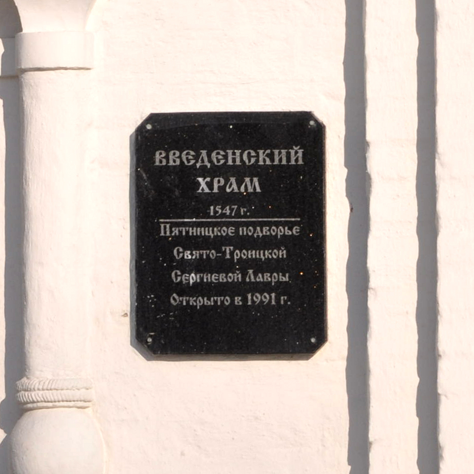 За пределами Лавры самые древние здания Сергиева Посада — стоящие на подоле монастыря Введенская и Пятницкая церкви. Обе они были построены в 1547 году на средства Ивана Ивановича Хабарова, боярина, воеводы и доверенного лица царя Ивана Грозного. История этих храмов сложна: они дважды переживали разорение и поругание (в Смутное и советское время), в разное время относились к мужскому и женскому монастырям, в период Великой Отечественной войны в их стенах размещалась городская мельница и склад муки и зерна.