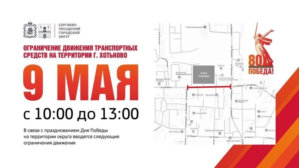 ❗️9 мая с 10:00 до 13:00 будет ограничено движение транспортный средств на территории г. Хотьково (Парк Победы) на участках дороги по ул. Калинина от КЦ «Елизавета Мамонтова» по ул. Лихачева.