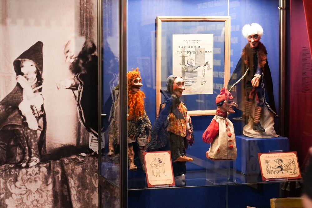 Особое место на выставке занимают экспонаты из Бахрушинского театрального музея, в том числе фронтовые куклы, ставшие в военные годы одними из самых популярных героев постановок. Весёлый и ловкий Петрушка, олицетворяющий народную смекалку и оптимизм, в кукольных представлениях смело противостоял злу в образах Фрица и Гитлера. Фронтовые куклы, и особенно знаменитый Петрушка, стали настоящими любимцами солдат. Спектакль «Петрушка на войне», поставленный в 1941 году, неоднократно побывал в зоне боевых действий, даря бойцам минуты радости и надежды.