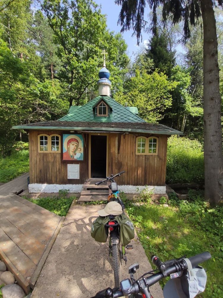 Добрались до Муранова и сделали привал у реки Талицы. Отдохнули и поехали дальше любоваться красотой церквей и источников в Артёмово. Сознательно решили не идти по пути к Лесному скиту, потому что тащить велосипеды по лесу на себе отнимает в разы больше сил, чем просто идти или ехать. От Артёмова до Абрамцева снова пришлось добираться по лесу. В Абрамцеве сделали привал, а затем бодро доехали до Хотькова, где в Покровском монастыре похоронены родители Сергия Радонежского. До Радонежа добирались вдоль автомобильной дороги, решив поехать в объезд лесного пути. Было очень жарко, и до Церкви Преображения Господня приходилось подниматься в гору, поэтому наверху я долго сидела и не могла отдышаться.