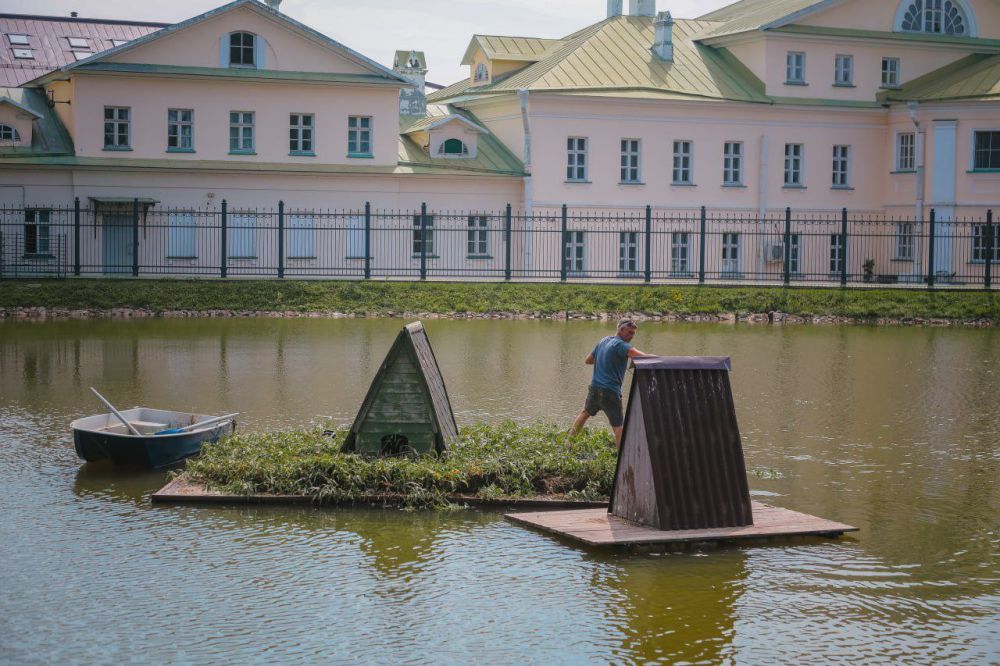 Дополнительный домик для лебедей, который успел перекочевать с середины «Белого пруда» к берегу водоёма, вернули на прежнее место