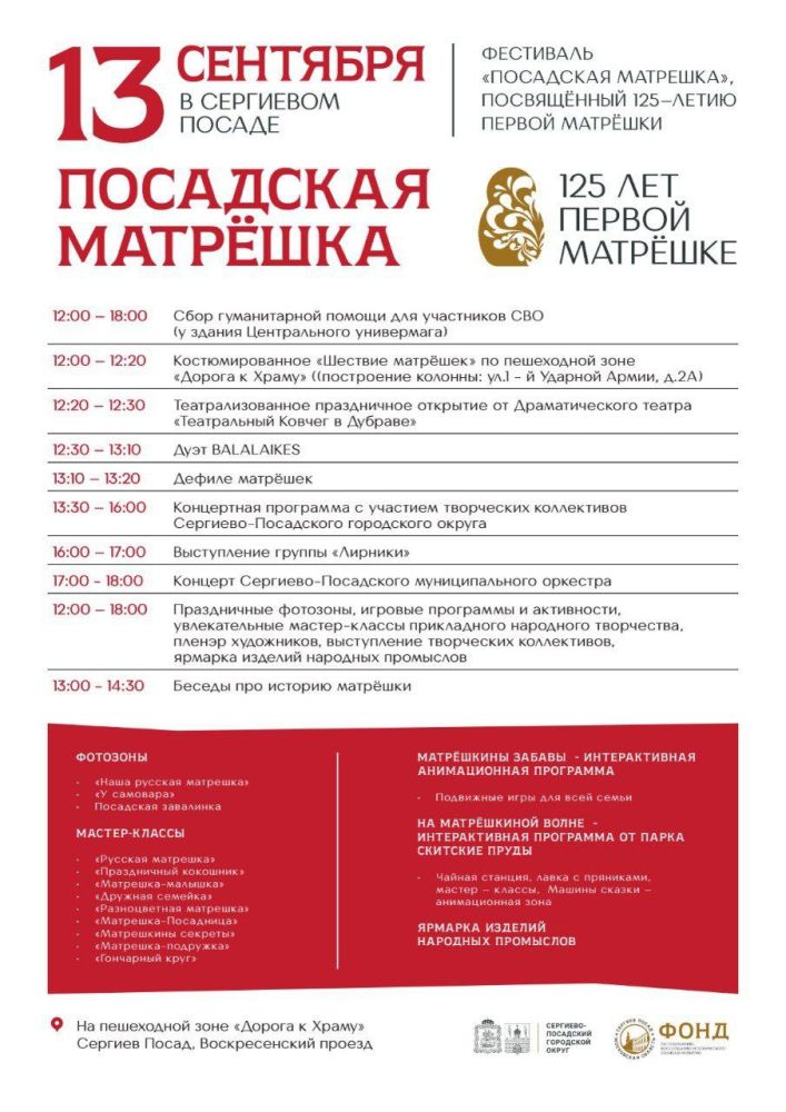 Сергиев Посад, город, по праву носящий звание колыбели знаменитой русской игрушки, готовится к грандиозному празднику. 13 сентября здесь отметят знаменательную дату – 125-летие первой матрёшки. В честь этого события пройдет масштабный фестиваль «Посадская матрёшка», который обещает стать ярким и незабываемым событием для жителей и гостей города.