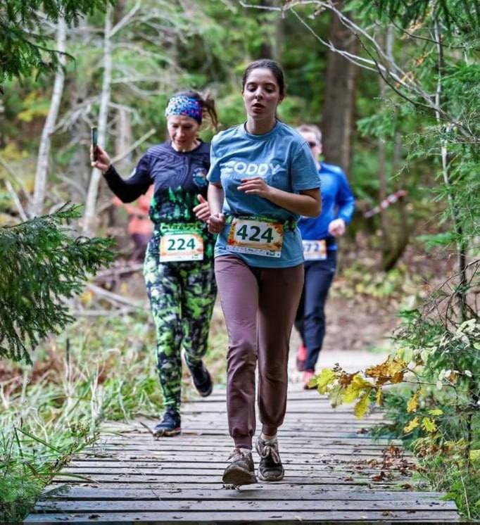 Мужчина более трёх лет организует забеги вместе с неизменной союзницей Татьяной Мендель, мастером спорта по спортивному ориентированию. Всё время она на подхвате: организует разминки, хлопочет о гостях и площадке, проверяет, все ли накормлены, согреты и довольны. Воздух, пропитанный запахом прелой листвы и сырой земли, пронзительная синева октябрьского неба и непредсказуемый рельеф под ногами. На поляне у Морозовского пруда знакомимся с супружеской парой из Пушкина. Они так же, как и мы, бегут пятикилометровку.