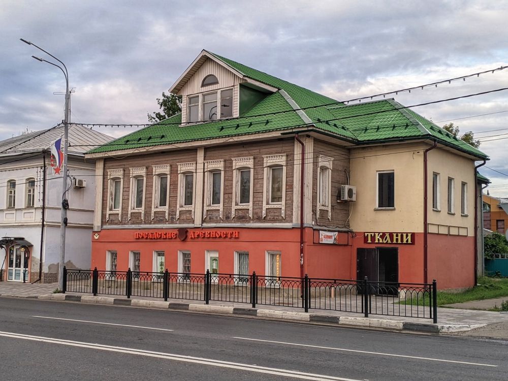 Сегодня внутри размещается салон антиквариата «Посадские древности» и магазин тканей. Довольно любопытный момент в биографии бывшего купеческого владения связан с его внешним оформлением.