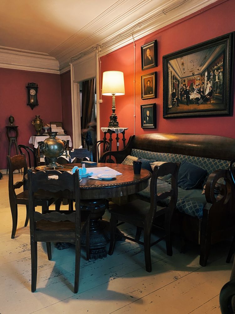 Таких выдержек в меню много. Из необычного здесь мы попробовали старорусские щи из баранины, левашник — традиционный жареный пирожок с клубникой и завершили трапезу чаем «по-достоевски», который был заварен определённым способом и к которому подавалась пастила двух видов и домашний мармелад.