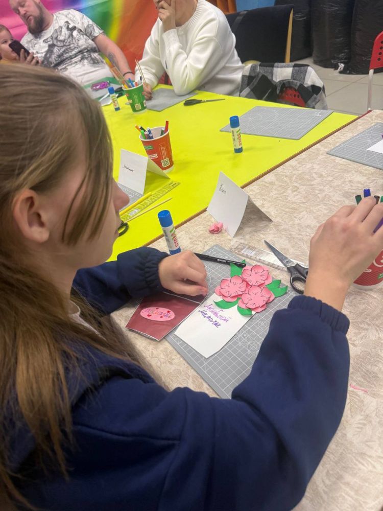 Открытку для мамы в виде кашпо с фиалками сделали дети из семей участников СВО в преддверии Дня матери.