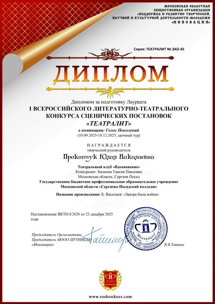 Театральный клуб Сергиево-Посадского колледжа – лауреат Всероссийского литературно-театрального конкурса