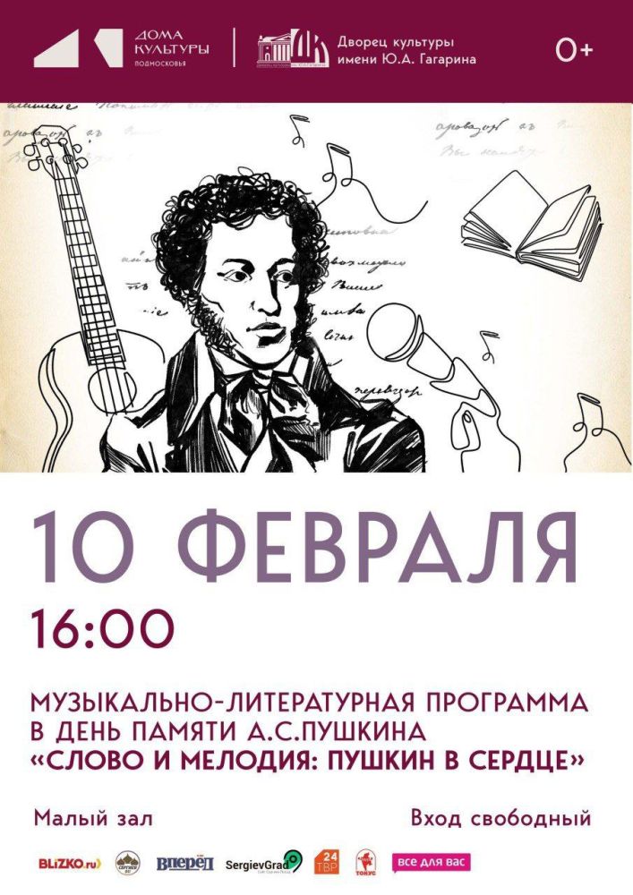10 февраля в ДК им. Ю.А. Гагарина состоится музыкально-литературная программа «Слово и мелодия: Пушкин в сердце». Малом зале прозвучат стихи и отрывки из его произведений, а также музыкальные композиции, авторы которых были вдохновлены поэтическим словом классика.