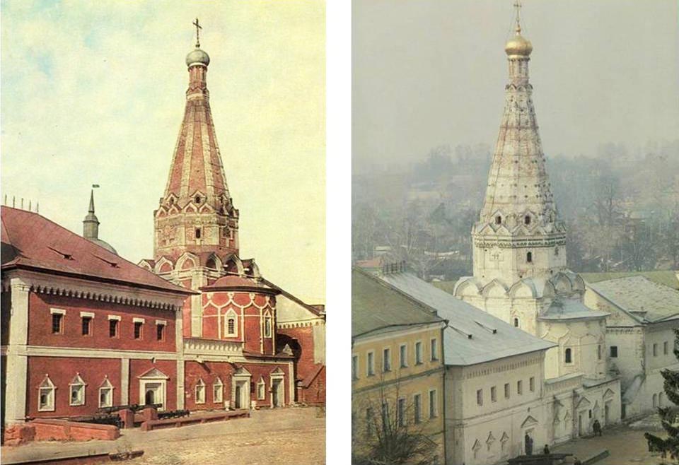 Позже В. И. Балдин перекрасил их в белый цвет. Каждый из архитекторов приводил свои доводы, которые до настоящего времени не подтверждены документально. В начале XIX века с пятиглавой надвратной церкви Иоанна Предтечи были сняты четыре боковые главы, которые показались лаврскому руководству «излишними», да и золотить все пять глав было дорого. Пятиглавие было восстановлено в 1976 году архитектором Юрием Беляевым. А вот расколеровка сооружения «в шахмат» (2010 г.) вызывает сомнения в её «первоначальности».