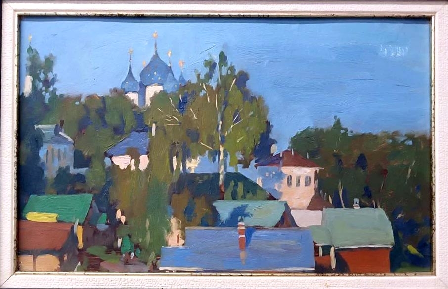 Подмосковные сады, посадские пейзажи и портрет жены в образе «Русской красавицы» — примечательно, что кокошник на модели выполнен тоже руками художника. Исторический костюм — одно из его увлечений.
