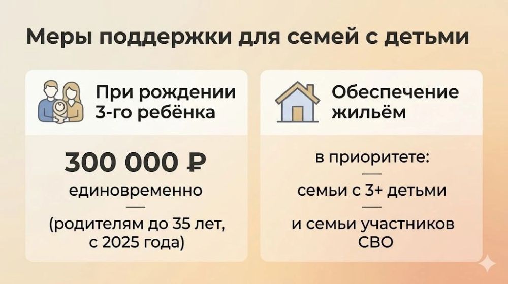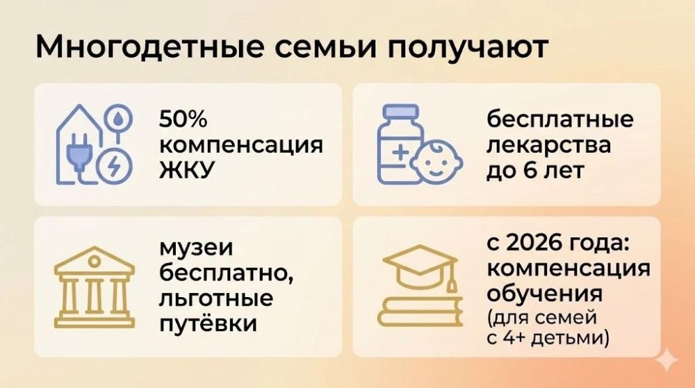 Помощь включает компенсацию школьного питания, проезда в общественном транспорте, коммунальных услуг, затрат на школьную форму и отдых. Многодетные семьи также вправе рассчитывать на материнский капитал, земельные участки и участие в программе семейной ипотеки.