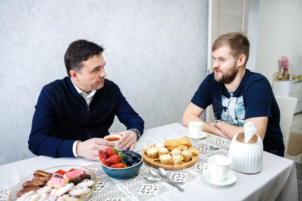 Губернатор Подмосковья Андрей Воробьев заехал в гости к заведующему поликлиникой РБ Алексею Булдакову, переехавшему в новую квартиру из аварийного жилья